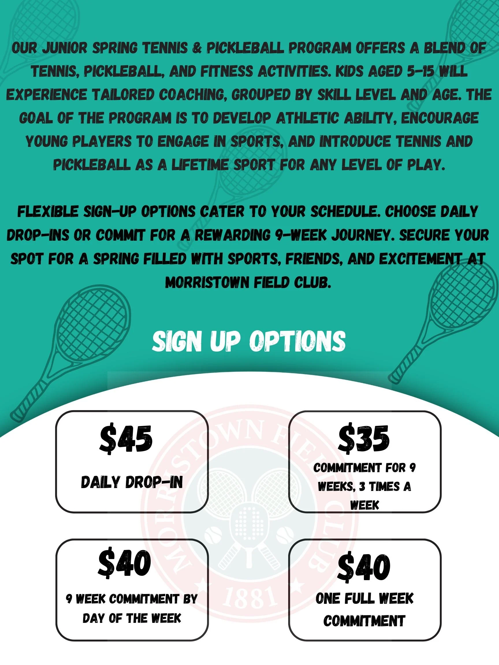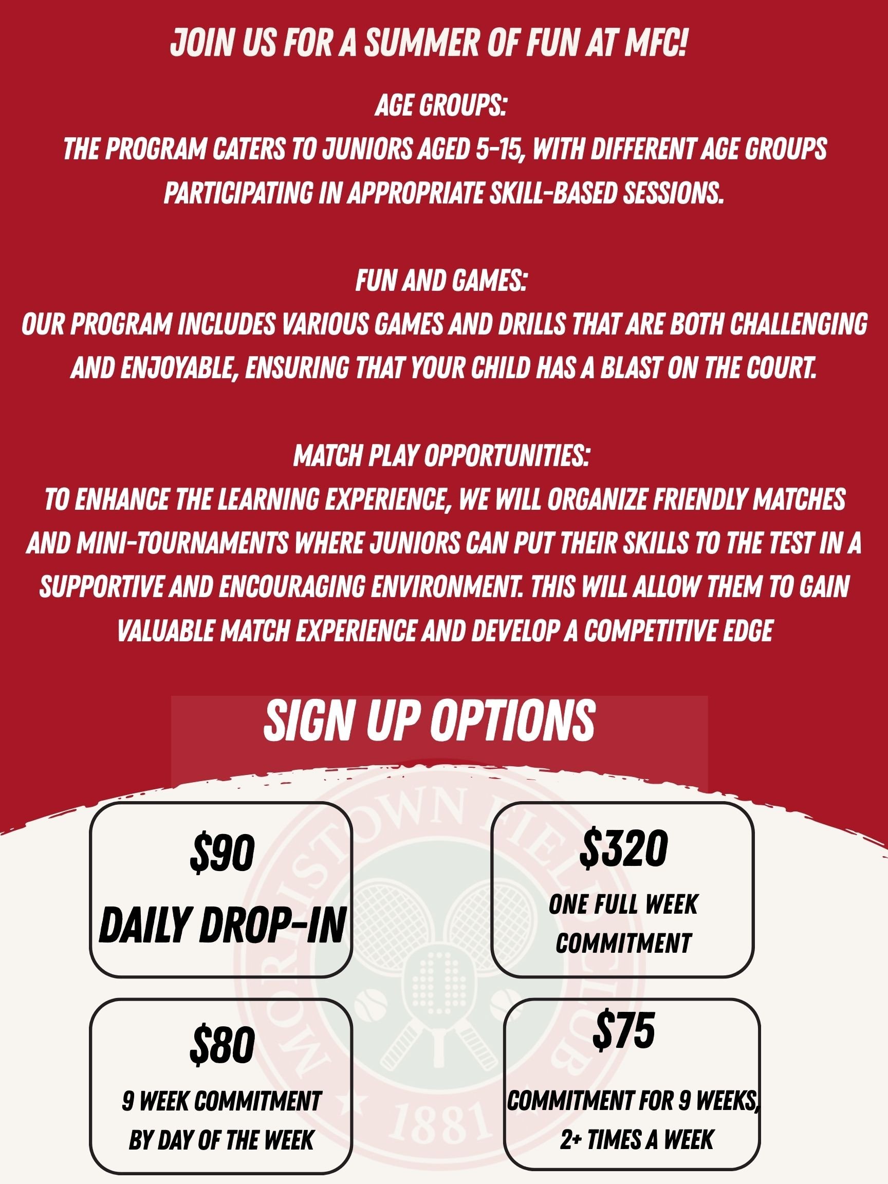 Kids are grouped by age + ability, so beginners feel comfortable and experienced players stay challenged. Expect lots of movement, skill-building, smiles, games and friendly competitions with prizes every week.